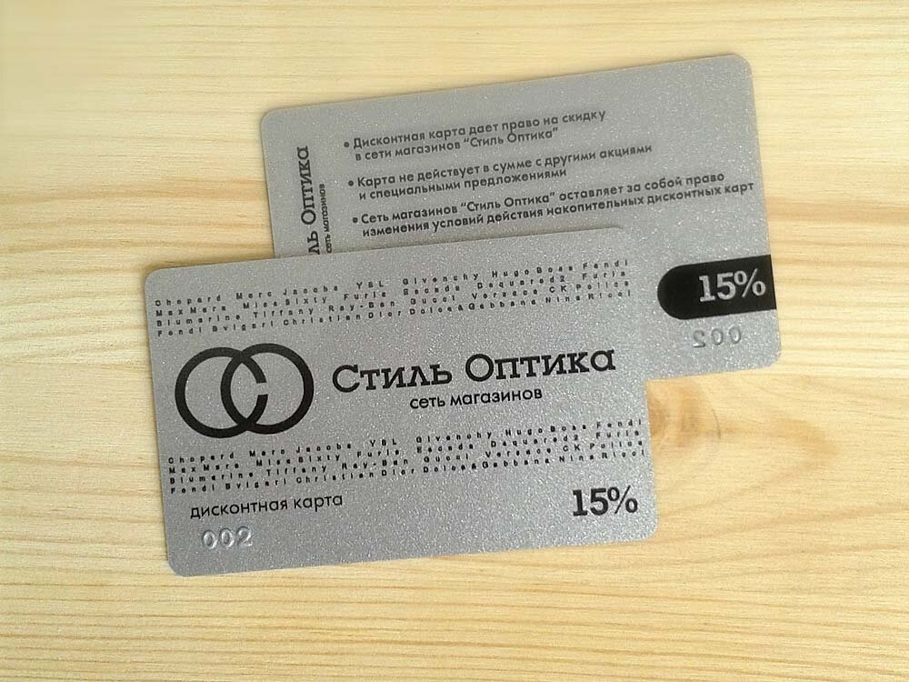 Печать пластиковых карт на серебряном пластике для сети магазинов «Стиль Оптика»